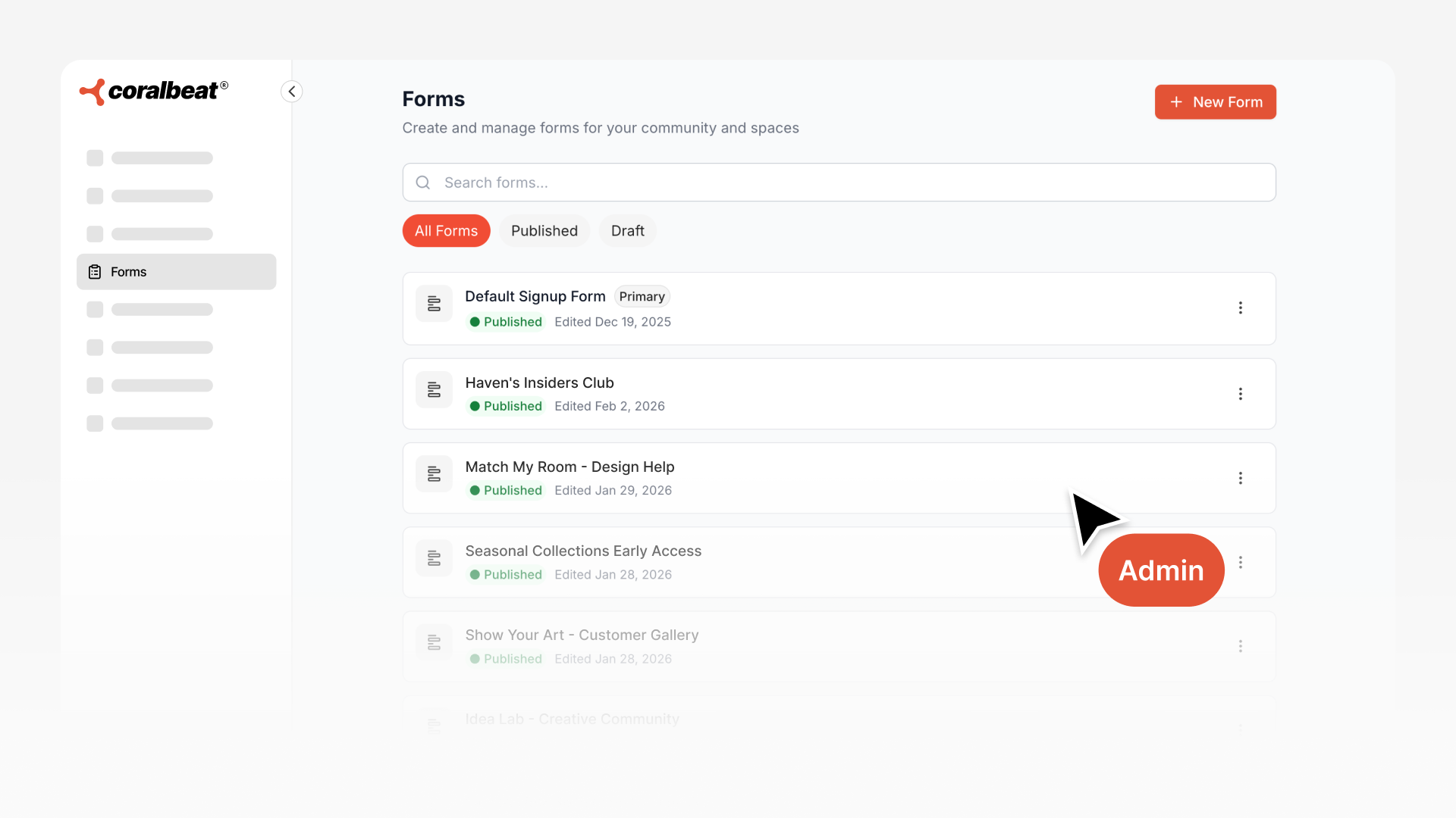 Access all your signup forms from Settings → Forms in your Admin Dashboard. The interface gives you everything you need to create professional forms without any technical knowledge.
