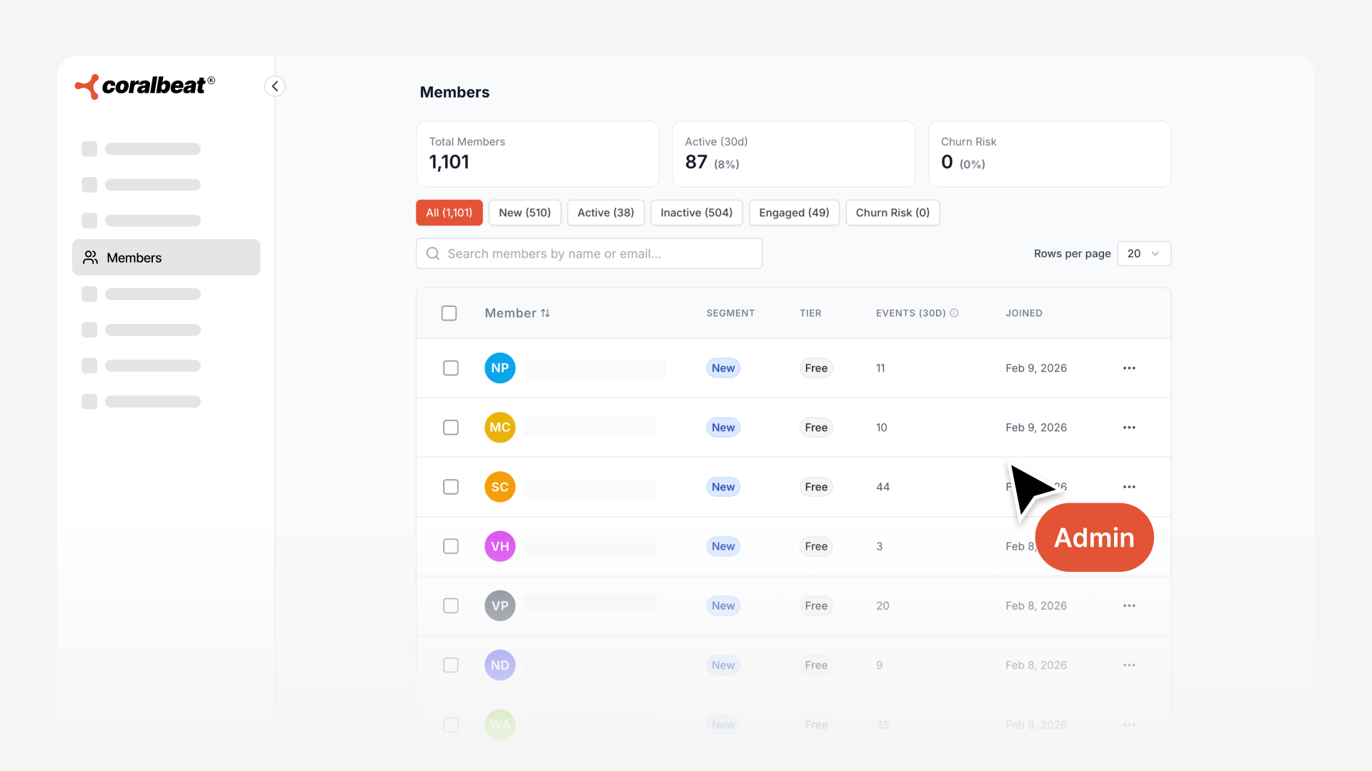 Coralbeat's admin dashboard automatically monitors activity, calculates engagement patterns, and surfaces the members who need your attention. No manual tracking. No spreadsheets. You instantly see who just joined and needs a welcome, who's ready for leadership roles, and who was active for months but recently disappeared.